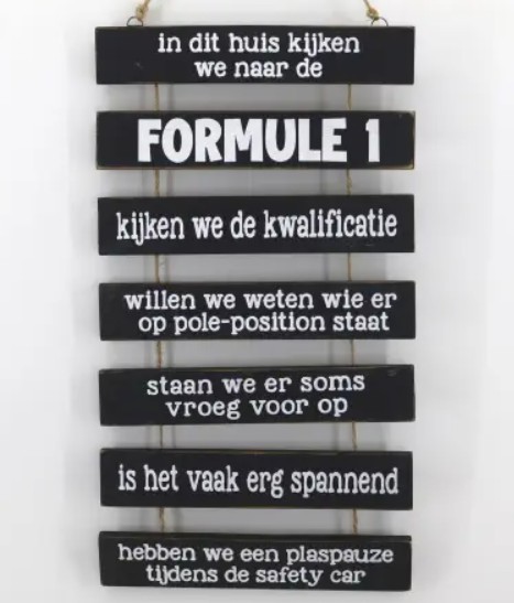 Tekstbord 7 latjes | In dit huis kijken we naar formule 1 (43x24cm)