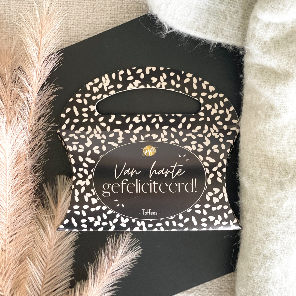 Verras iemand met dit compacte en schattige snoeptasje gevuld met 10 heerlijke toffees. Met vrolijke teksten en een handig hengsel is het het perfecte cadeau voor een verjaardag, bedankje of spontane zoete verrassing.